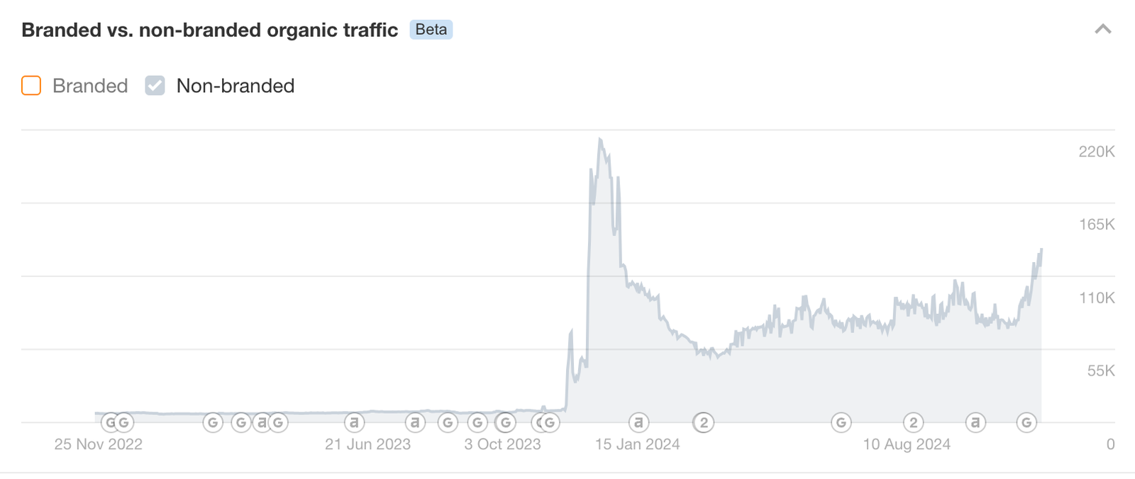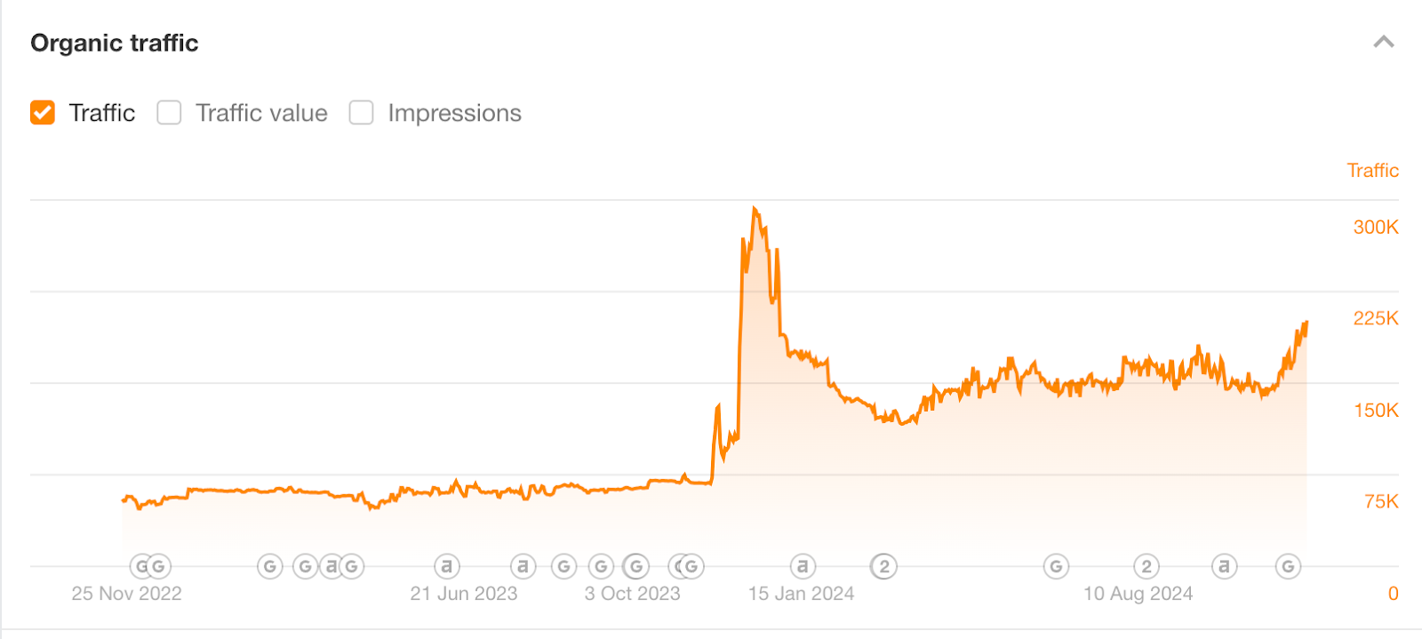 The graph shows a significant spike in organic traffic immediately following the site merger in early 2024, followed by a short adjustment period and steady recovery.
