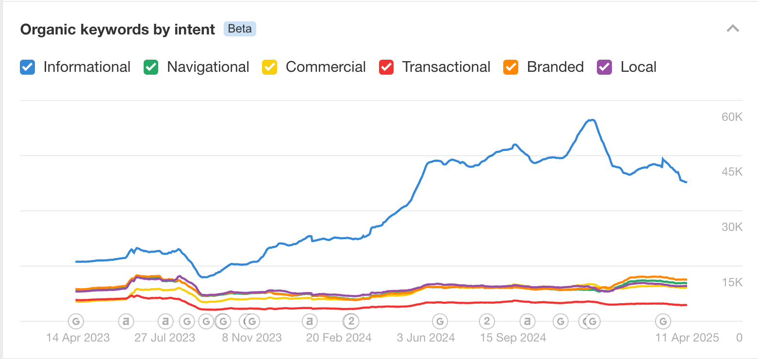 Informational and commercial intent keywords surged, indicating a higher rate of discovery for patient research and appointment-driven searches. Users with high intent keywords are more likely to engage and convert.