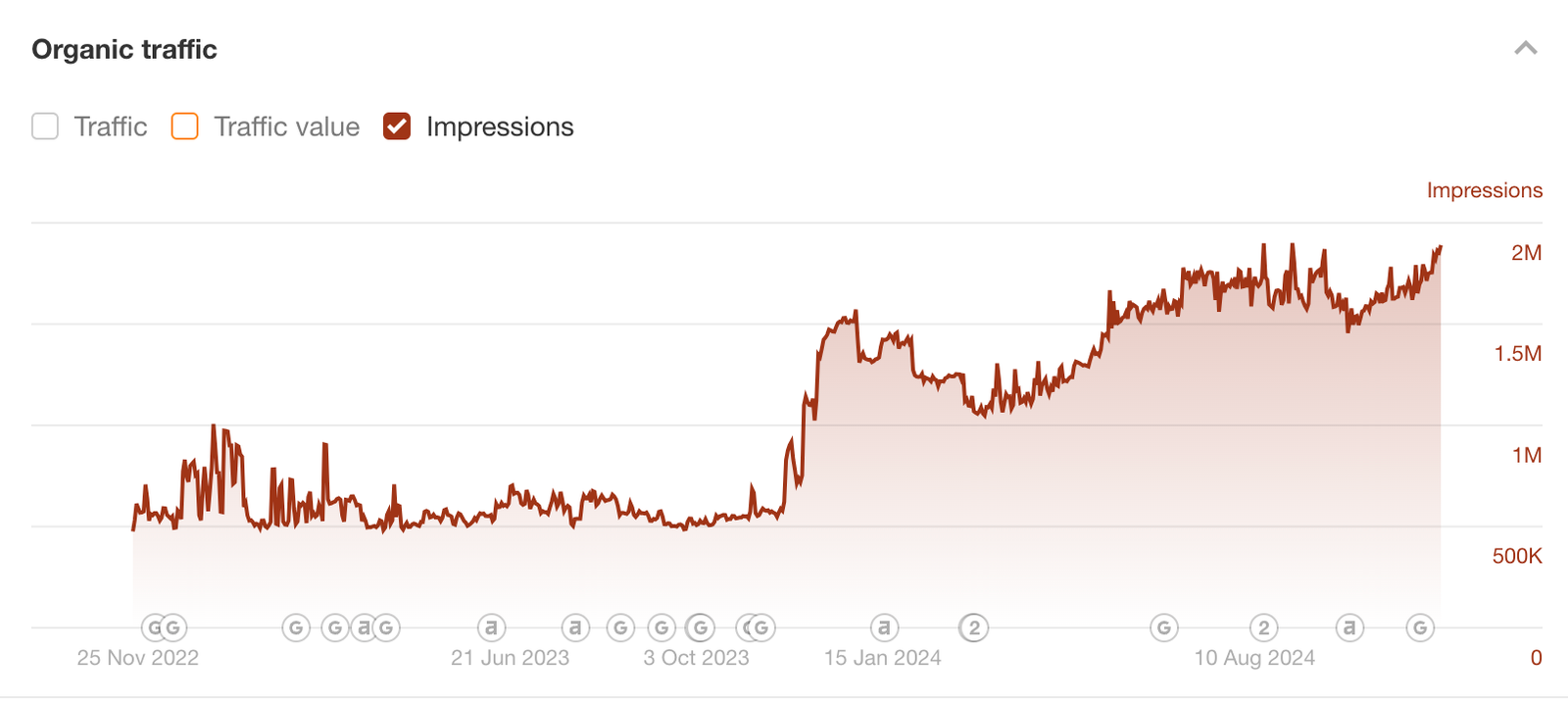 Impressions rose sharply to over 2 million per month, proving the consolidated domain’s expanded reach and visibility.